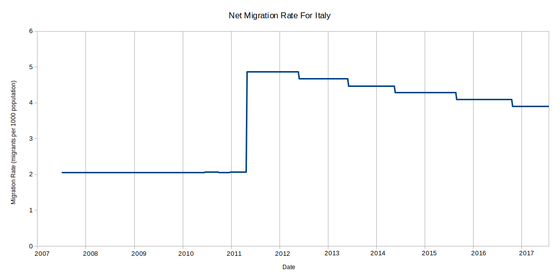 A spike in Net Migration Rate for Italy in 2011 is clear, which indicates increased migration (possibly due to the Arab Spring or a precursor to the European Migrant Crisis).